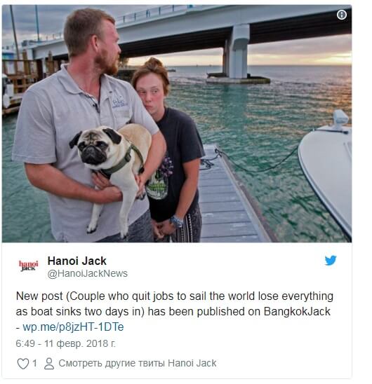 Однако в среду вечером их лодка наткнулась на что-то под водой и пошла ко дну неподалеку от популярной среди туристов рыбацкой деревни. Бродвелл и Уолш успели забрать карты социального обеспечения, немного наличных денег, документы, телефон и двухлетнего мопса Реми.