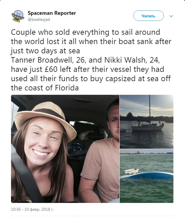Жители Колорадо Таннер Бродвелл и Никки Уолш потеряли все, чем владели, отправившись в путешествие на лодке, которая затонула на следующий же день. Об их истории узнало издание Tampa Bay Times, пишут РИА Новости.