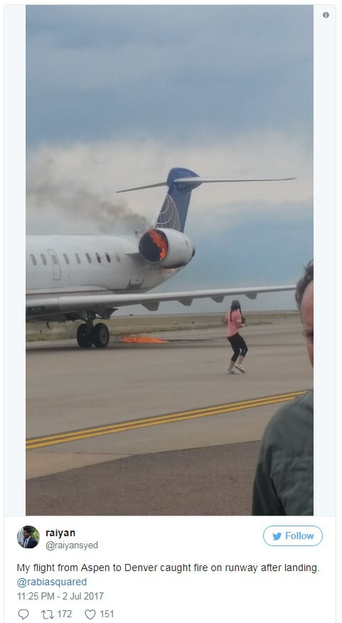 Quick and immediate response. first responders on runway. Huge thanks to pilot and crew for helping get passengers off safe. #Denver. pic.twitter.com/ZAlslCTemh