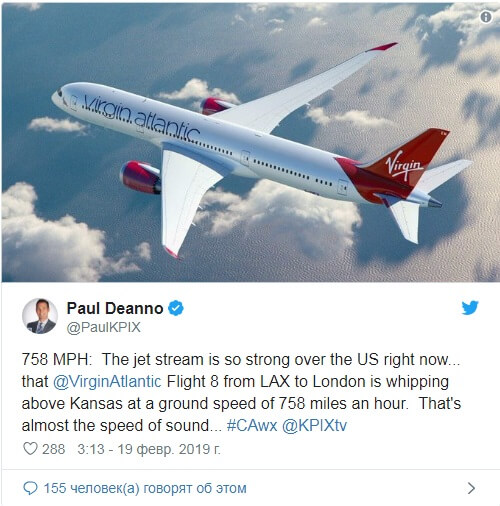 Крейсерская скорость такого самолета составляет 561 милю в час (902 км/ч), но реактивный ветер разогнал лайнер до 1285 км/ч, позволив ему превысить скорость звука, составляющую 1234 км/ч. Стоит добавить, что пассажирскому самолету повезло: попадание в высотное струйное течение может быть опасным из-за сильной турбулентности.