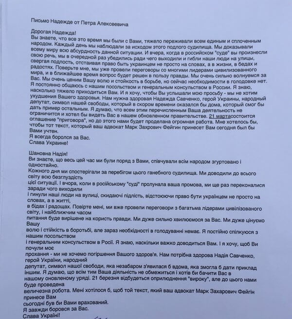 Как заявил Кузнецов радиостанции Говорит Москва, написать письмо было решено, после того как Савченко объявила сухую голодовку, чтобы «попробовать сделать так, чтобы она уже успокоилась».