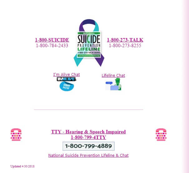 Горячие линии работают также по номерам: 800-SUICIDE (784-2433), 800-799-4TTY (4889) и другим номерам, о которых можно узнать больше на сайте Suicide Hotlines. По информации, представленной там же, на звонки отвечают «несовершенные люди, готовые помочь, многие из которых волонтеры».