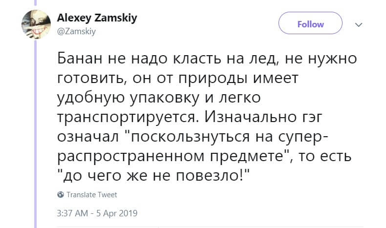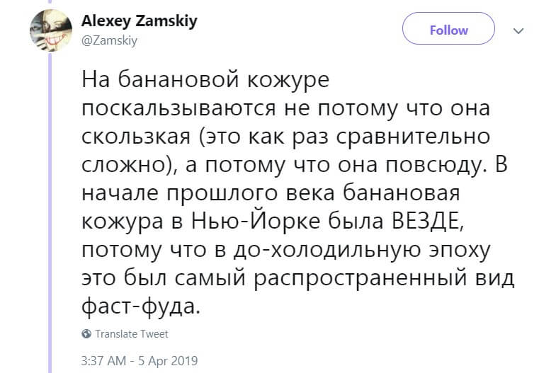 Замский рассказал, что шутка с банановой кожурой связана не с тем, что она скользкая. А с тем, что в начале 20-го века бананы стали самой популярной уличной едой в США. До этого американцы были почти не знакомы с этим фруктом: он считался дорогим и экзотическим.