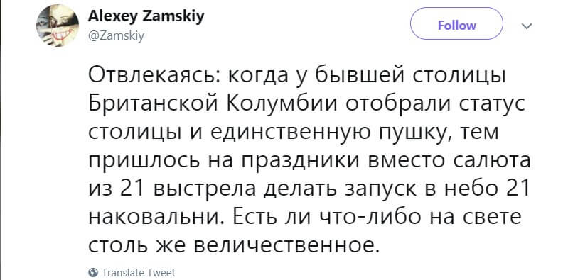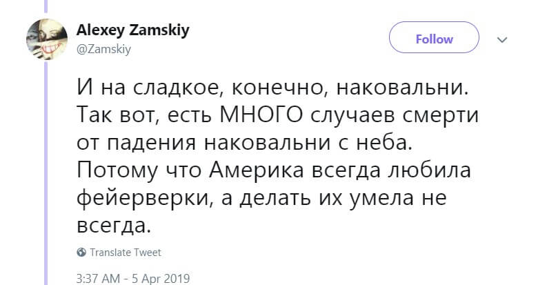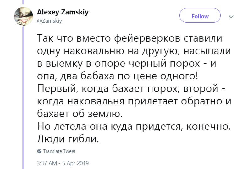Объяснение падающих на голову наковален Замский нашёл в американской истории. Ещё давно в Британии наковальни проверяли на прочность с помощью запуска в небо: в выемку насыпали порох, поджигали, после чего те взлетали на несколько десятков метров и падали. Считалось, что если наковальня после такого не разбилась, то её можно использовать.