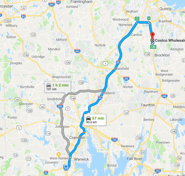 В штатах есть очень популярная сеть магазинов Costco — аналог сети Metro, где часто можно купить разные продукты, одежду и прочие товары значительно дешевле, чем в обычных, розничных магазинах. Когда я жил в Висконсине, то ближайший магазин располагался в 10 минутах от дома, но в штате Род-Айлэнд этой сети магазинов нет, и нам приходится ездить в соседний штат Массачусетс в часе езды или 90 км: