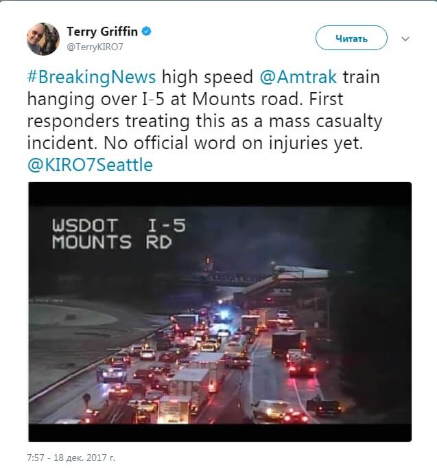 Пассажирский поезд Amtrak сошел с рельсов и обрушился на оживленную трассу Interstate 5 в первый же день работы на маршруте. Сообщалось о большом количестве травмированных людей и смертельных случаях. Как минимум 6 человек погибло.