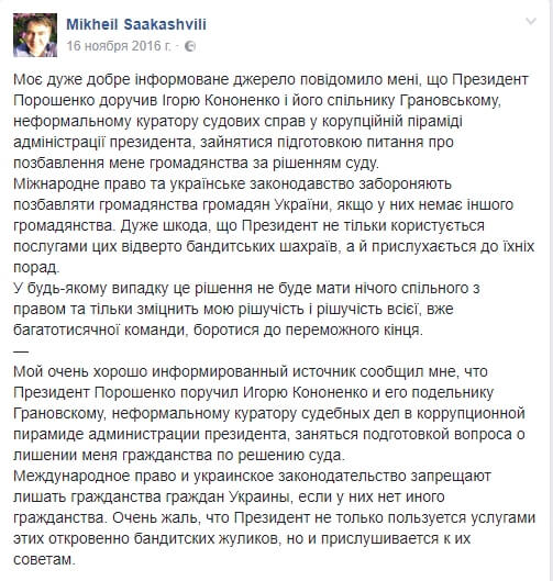 Вскоре после этого Саакашвили написал, что, по его данным, Порошенко намерен лишить его украинского гражданства. Экс-президент Грузии назвал эту меру незаконной, поскольку, по его словам «международное право и украинское законодательство запрещают лишать гражданства граждан Украины, если у них нет другого гражданства».