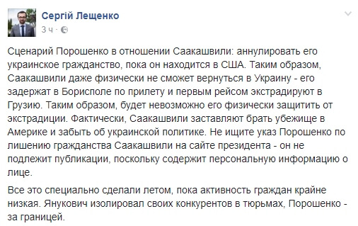 Тем времнем, Сергей Лещенко, украинский политик, написал на своей странице в Facebook, что «таким образом, Саакашвили даже физически не сможет вернуться в Украину — его задержат в Борисполе по прилету и первым рейсом экстрадируют в Грузию. Таким образом, будет невозможно его физически защитить от экстрадиции. Фактически, Саакашвили заставляют брать убежище в Америке и забыть об украинской политике. Не ищите указ Порошенко по лишению гражданства Саакашвили на сайте президента — он не подлежит публикации, поскольку содержит персональную информацию о лице. Все это специально сделали летом, пока активность граждан крайне низкая. Янукович изолировал своих конкурентов в тюрьмах, Порошенко — за границей».