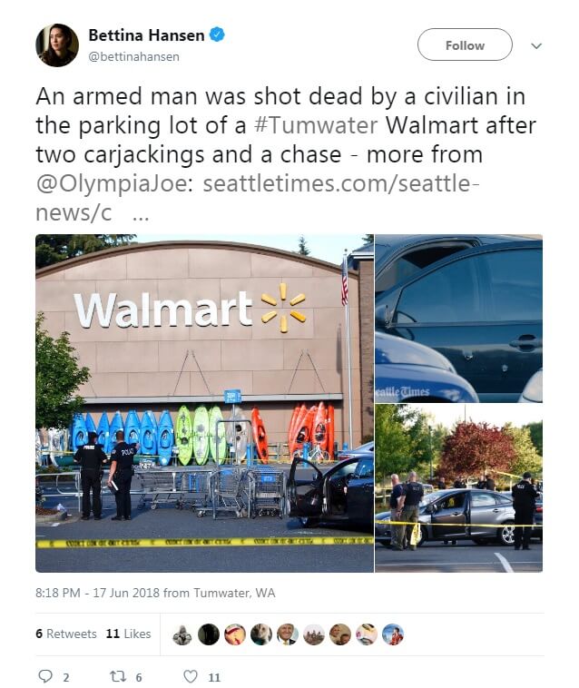 Brian went to aid of shooting victim in #Walmart parking lot in Tumwater. Says armed pastor who is firearms expert killed gunman. Calls him a “hero” for acting and is convinced lives were saved as a result. pic.twitter.com/7a8KYZlZBK