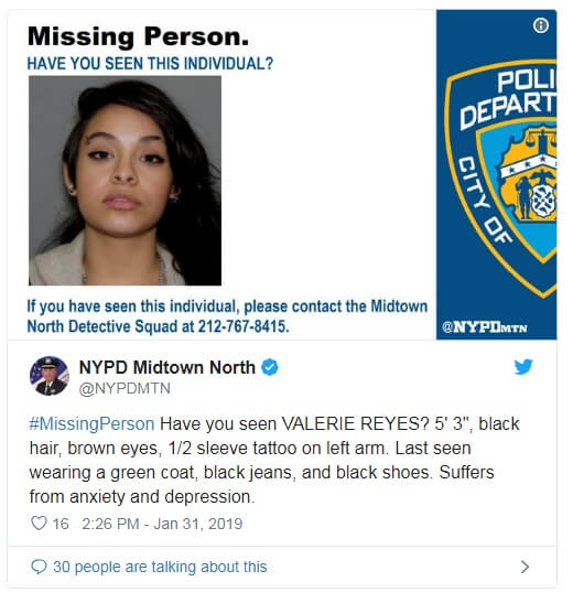 Согласно сообщению ABC News, Валери Рейес из Нью-Рошель, штат Нью-Йорк, пропала без вести 30 января, на следующий день после того, как ее видели в последний раз.