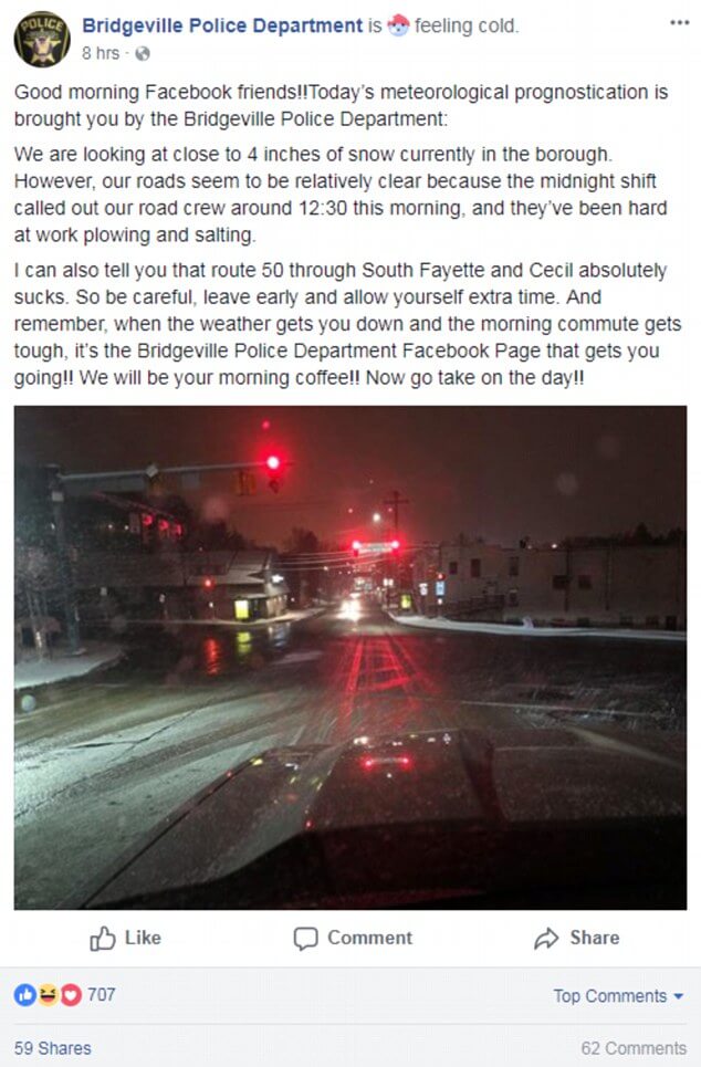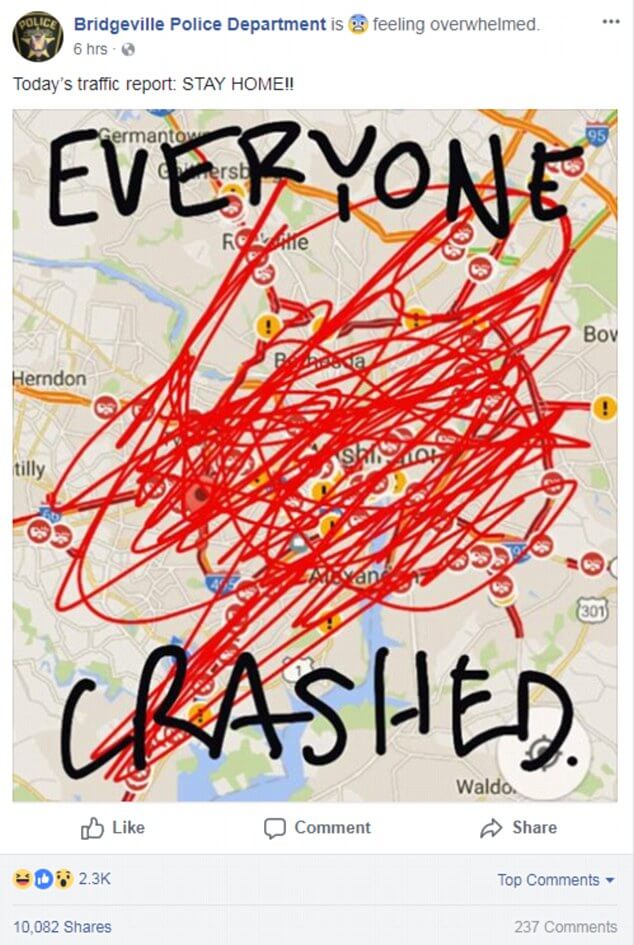 Примерно в 9 часов утра полицейский участок Бриджвилля попросил жителей по возможности оставаться дома, так как из-за ненастной погоды дорожные условия крайне опасные. В сопровождении к предупреждению они опубликовали картинку с надписью «Все попали в аварию».