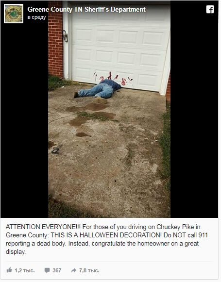 Полиция на своем сайте указывает, что это — украшение для Хэллоуина. «Не звоните в 911, сообщая о мертвом теле, — сказал Департамент шерифа округа Грин в Facebook. — Вместо этого, поздравляйте домовладельца с невероятной инсталляцией».