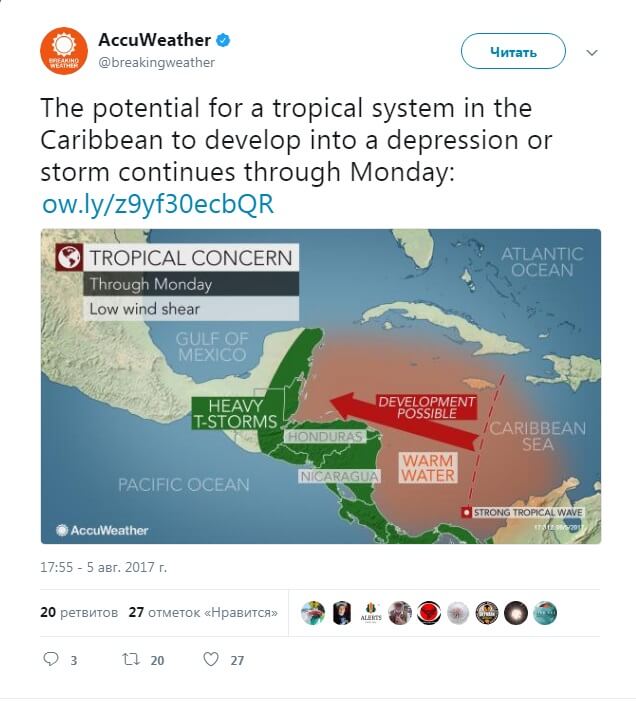 Шторм «будет сопровождаться пронизывающими дождевыми шквалами через Центральную Америку и полуостров Юкатан», — сообщили в AccuWeather, предупреждая об отключениях электроэнергии.