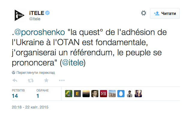 «Вопрос о вступлении Украины в НАТО является фундаментальным. Я намерен провести референдум, чтобы народ принял решение», — цитирует канал слова Порошенко.