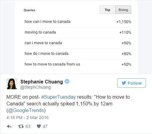 После «супервторника», по результатам которого Дональд Трамп намного вырвался вперед, количество запросов в Google «как переехать в Канаду» увеличилось на 350 %.