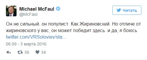 Бывший американский посол в России Майкл Макфол также высказал опасения по поводу лидирующего Трампа. Он назвал его популистом и сравнил с Владимиром Жириновским, отвечая телеведущему Владимиру Соловьеву в Twitter.