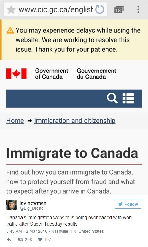 А иммиграционный сайт Канады перегружен посетителями после «супервторника».