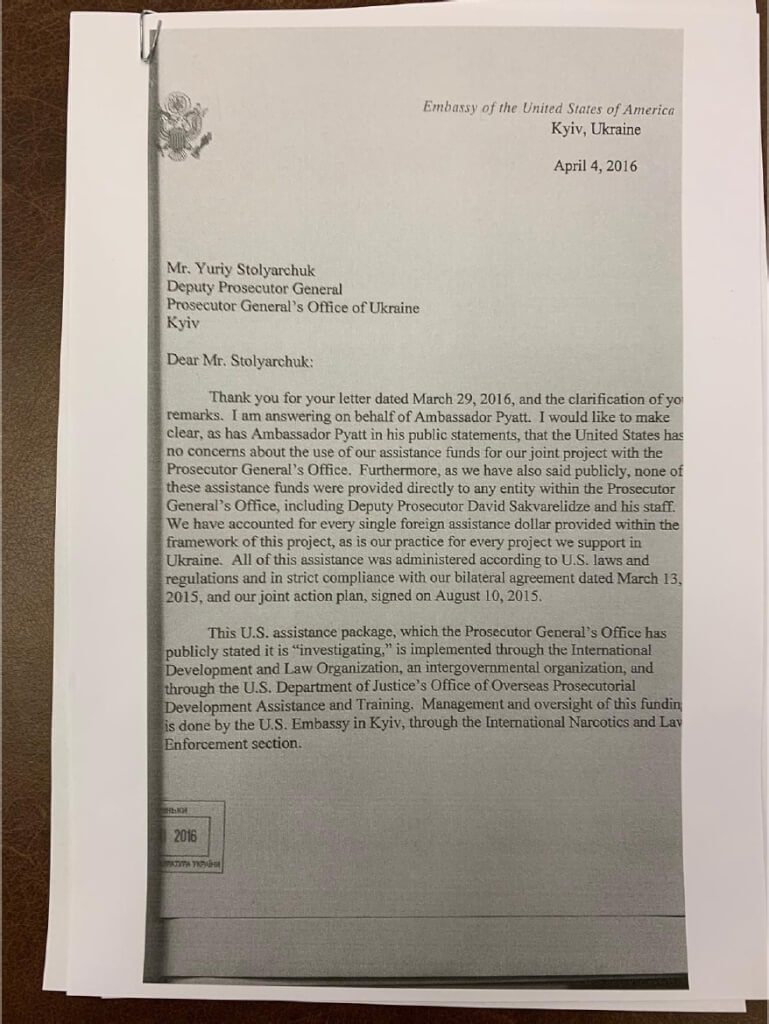 Во время разговора Луценко продемонстрировал письмо из посольства США, которое подтверждает часть сделанных им заявлений. Из документа следует, что американский чиновник действительно просил его прекратить дело о незаконном присвоении средств, выделенных Украине в качестве американской помощи.
