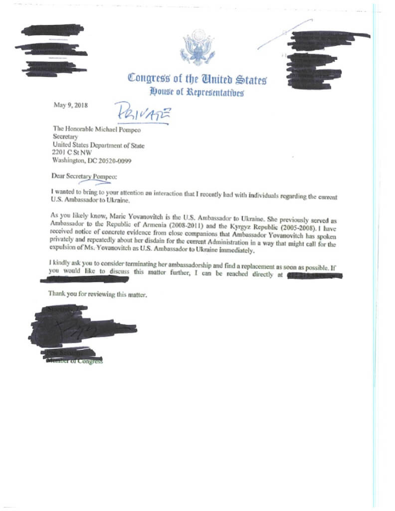 В прошлом году член Палаты представителей США Пит Питерс (республиканец из Техаса), который на тот момент занимал пост председателя Комитета по регламенту, написал личное письмо государственному секретарю Майку Помпео с просьбой отозвать нынешнего посла США в Украине Мари Йованович, утверждая, что она сделала пренебрежительные заявления о президенте Трампе.