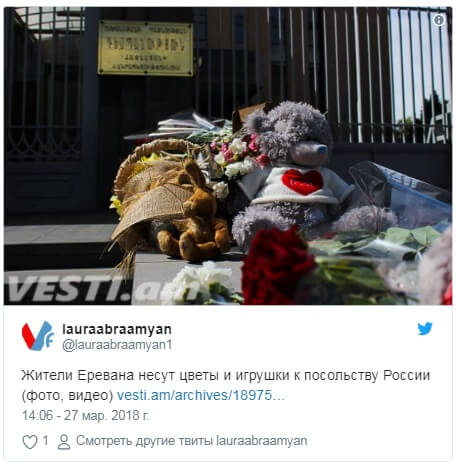 В разных городах России и в других странах люди продолжают приносить цветы и игрушки к российскому посольству.