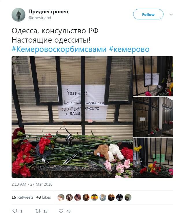 В Одессе к российскому консульству принесли цветы и свечи в память о погибших в Кемерово.