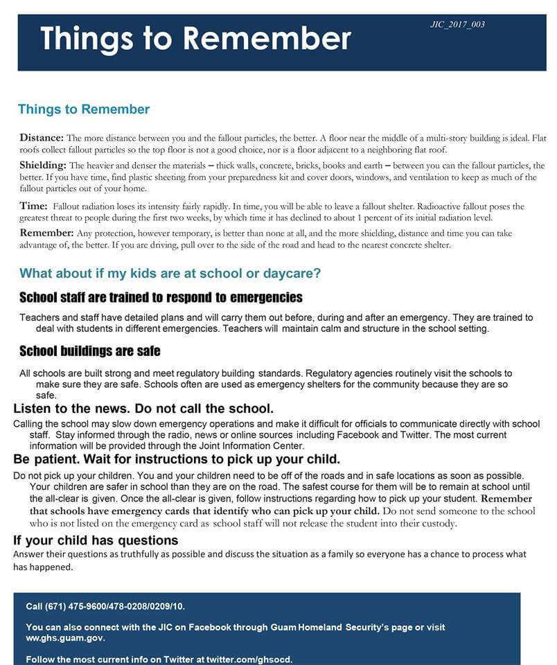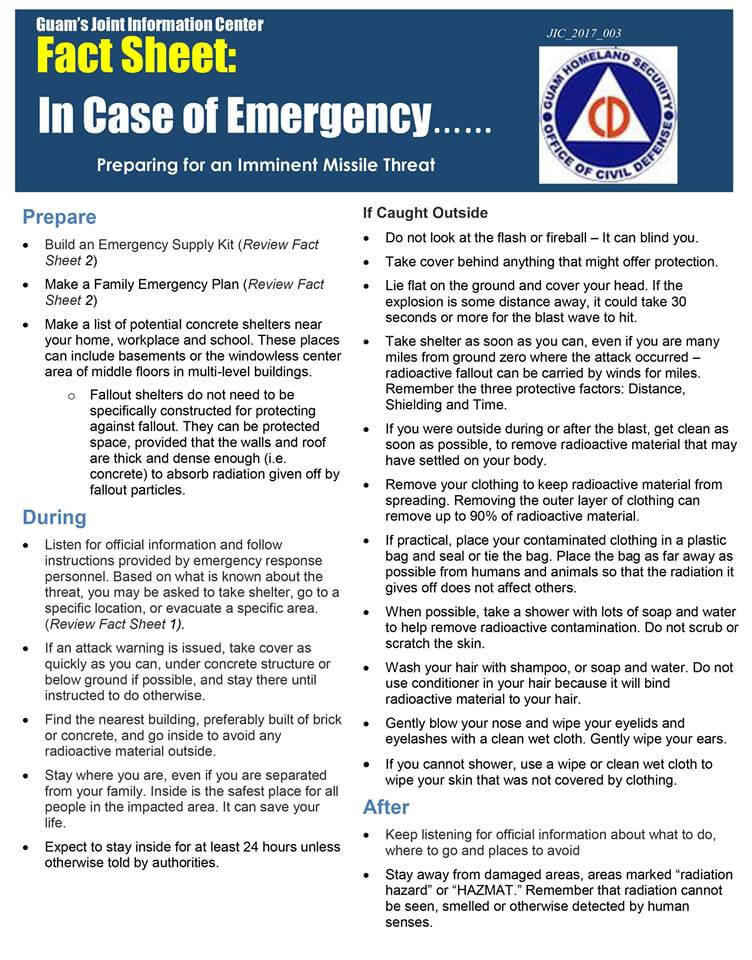 Управление гражданской обороны и Служба безопасности острова Гуам выпустило двухстраничный информационный бюллетень о том, как подготовиться к нападению и что делать, если атака произойдет на самом деле.
