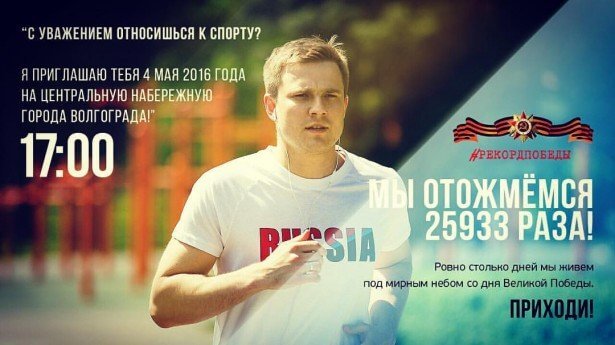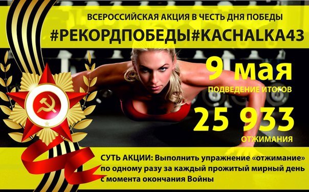 В больших городах России проводится акция, призывающая всех желающих отжаться 25 933 раза — ровно столько, сколько мирных дней прошло с момента окончания Второй мировой войны 9 мая 1945 года.