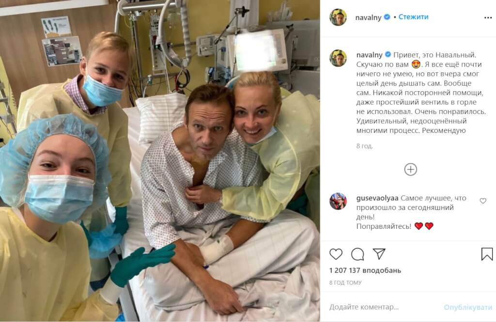 В Instagram Алексея Навального появилась его первая фотография после того, как он впал в кому 20 августа и позже был доставлен в берлинскую клинику «Шарите». Накануне немецкая клиника сообщала, что состояние здоровья оппозиционера улучшилось, он может вставать с кровати и его отключили от ИВЛ.