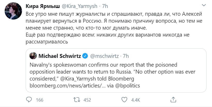 Пресс-секретарь Навального Кира Ярмыш это подтвердила.