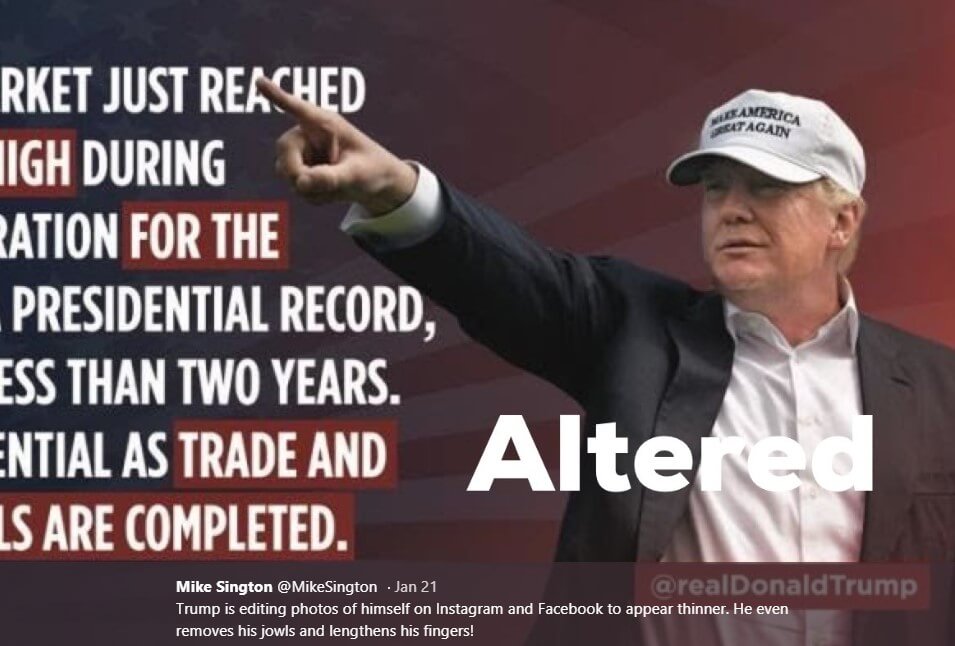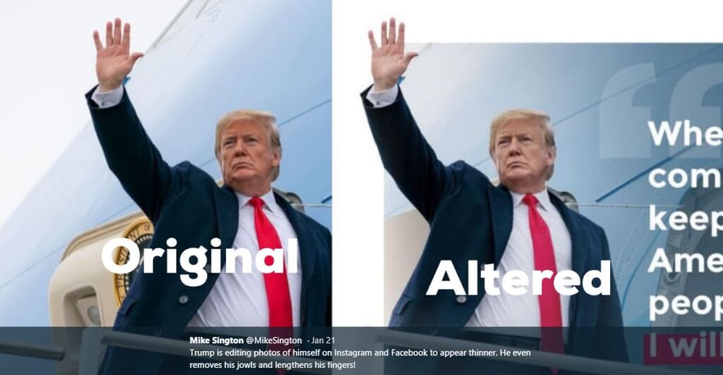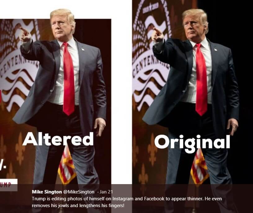 На некоторых снимках в соцсетях президент выглядит стройнее и опрятнее, чем на оригинальных фотографиях, пишет ВВС. Пользователи соцсетей поспешили указать на возможные изменения в этом изображении, которое было опубликовано в официальных аккаунтах Трампа в Instagram и Facebook.