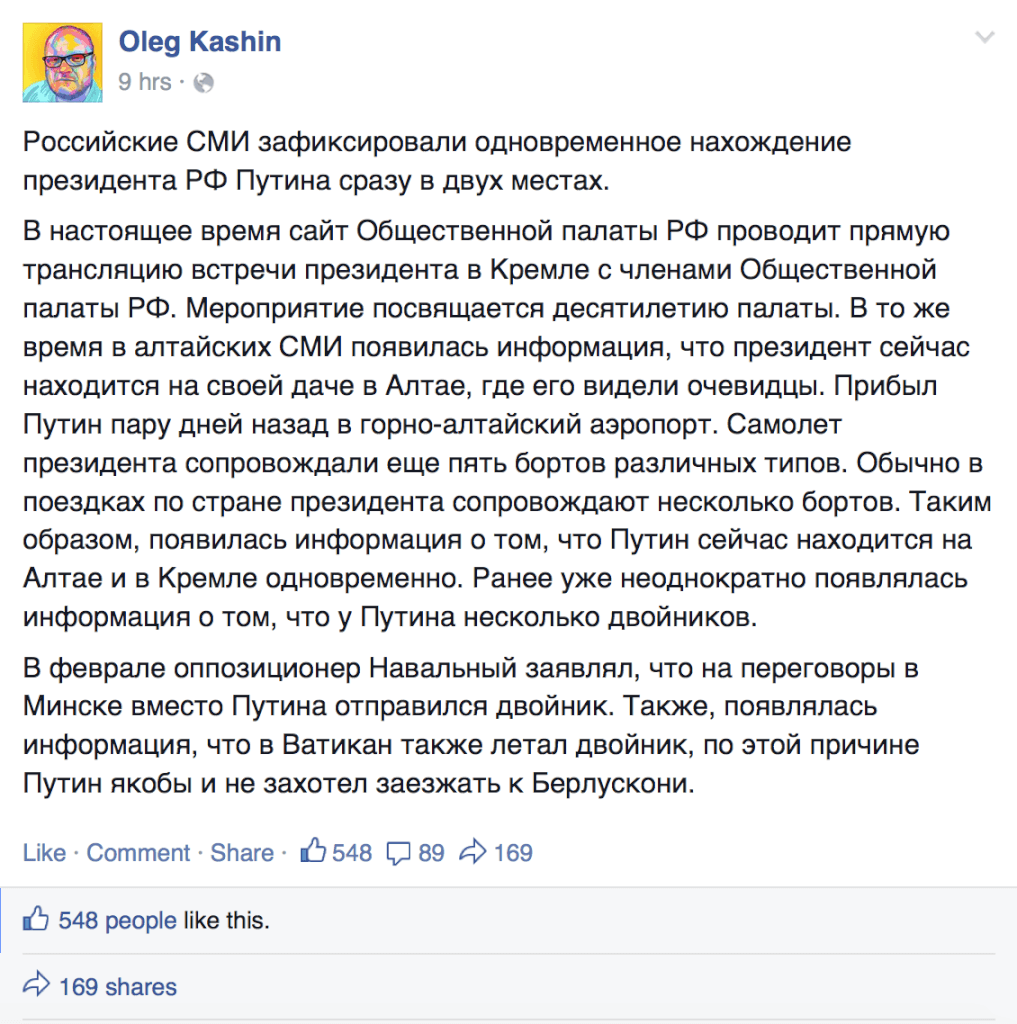 Российские СМИ зафиксировали одновременное нахождение президента РФ Путина сразу в двух местах. Об этом в своей страничке в Фейсбук написал российский журналист Олег Кашин.