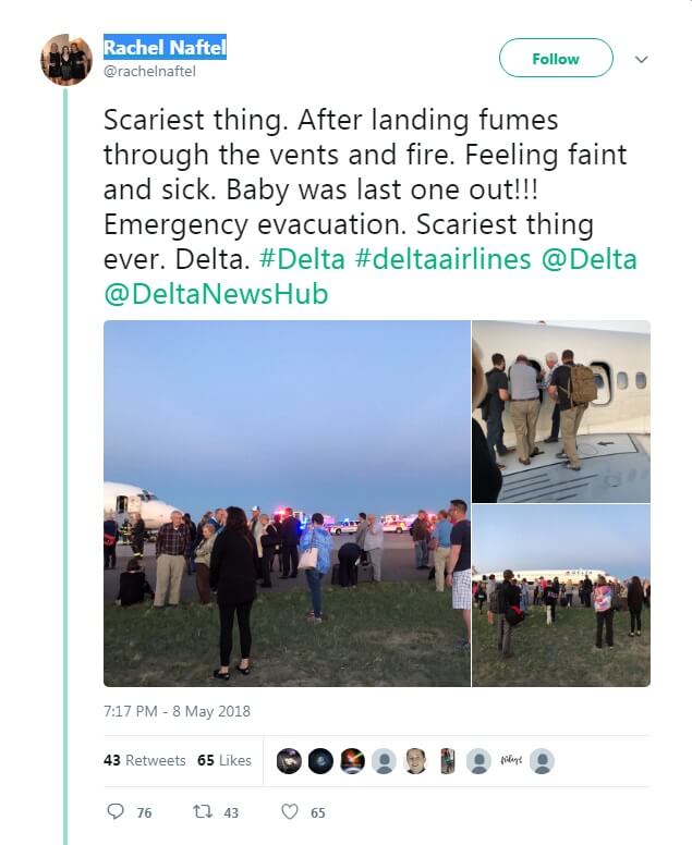 Другой пассажир, Рейчел Нафтель, написала в Twitter, что ей стало плохо после эвакуации. Она также утверждает, что ее ребенка сняли с самолета в последнюю очередь, написав, что это было самым страшным для нее.