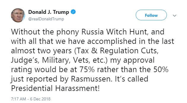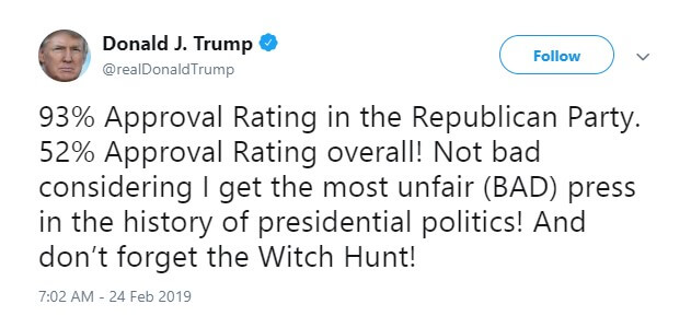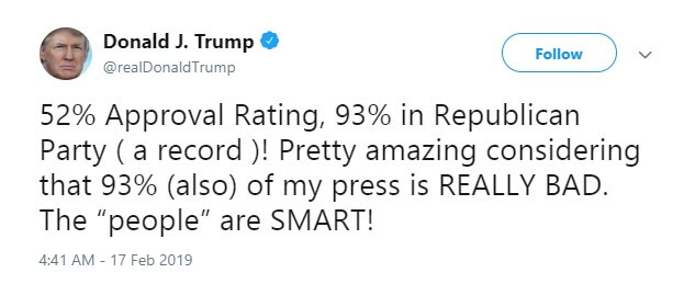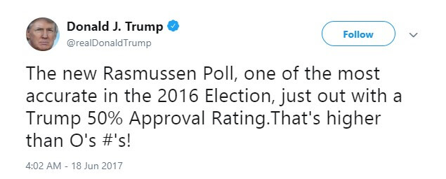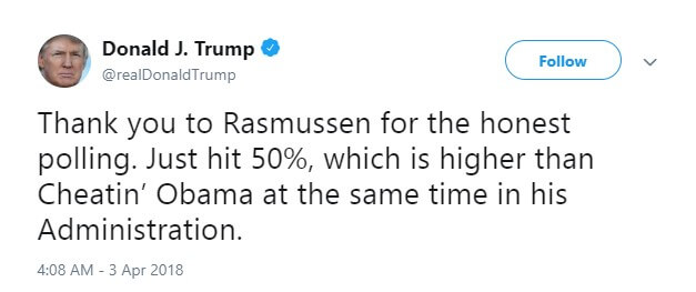 Последний твит о 50% одобрении следует за чередой сообщений, опубликованных в течение нескольких недель до этого, когда Трамп озвучивал 52-процентный рейтинг одобрения (тоже от Rasmussen). Вот, например: