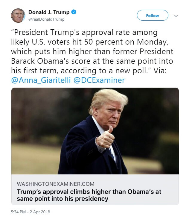 Но если Трамп набрал 50% хотя бы в одном опросе, почему бы это не отметить? Именно так, похоже, решил и сам президент США.