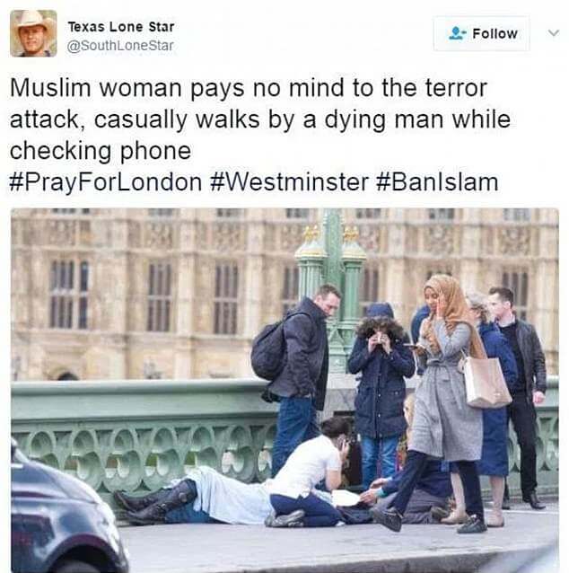 Фотография мусульманки, разговаривающей по телефону на фоне жертв теракта, стала вирусной. Женщину обвиняли в том, что она прошла мимо. Но позже выяснилось, что она пыталась вызвать помощь и выглядит явно обеспокоенной.