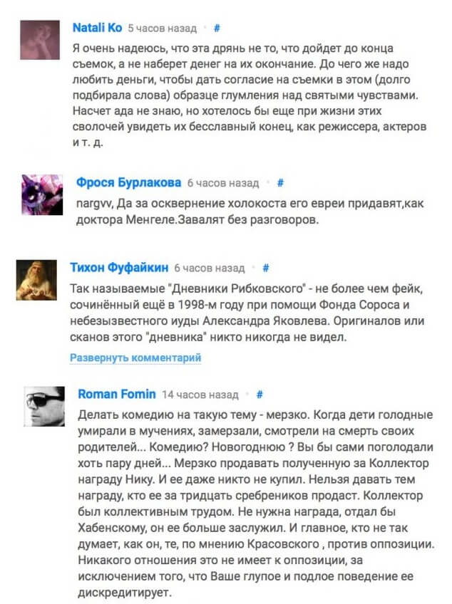 Я буду на всех площадках заявлять, что нельзя такие фильмы сегодня показывать в нашей стране. На мой взгляд, это абсолютное кощунство — снимать фильм-комедию о трагедии блокадного Ленинграда. Какой здесь может быть юмор, какая комедия? Это трагедия. Это провокация, которая опять запущена против истории нашей страны, против её настоящего. Это часть информационной войны. Она развязана Западом. Такие фильмы играют на руку тем людям, которые не хотят, чтобы наша страна была великой державой.