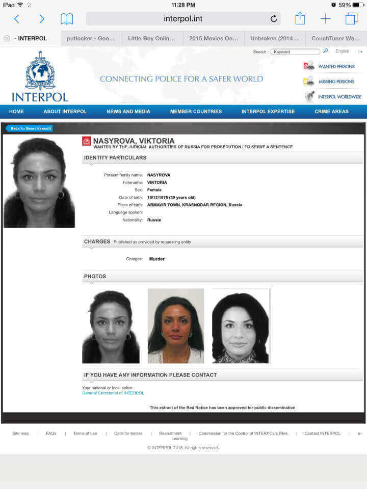 В США 42-летнюю Насырову подозревают в многочисленных преступлениях. Ей были предъявлены обвинения в серии грабежей и отравлений в Нью-Йорке, россиянка свою вину отрицала. По данным следователей, Насырова находила потенциальных жертв-мужчин на русскоязычных сайтах знакомств, назначала им свидания, а при встрече подмешивала в напитки или еду одурманивающие вещества, после чего грабила.