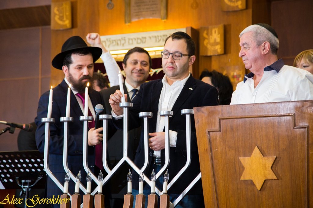 Кандидат в делегаты ВСК от AFI Раввин Бенцион Ласкин (слева) с коллегами в брайтонской синагоге Ocean View Jewish Center на зажигании ханукальной Меноры. Фото Ари Кагана и Алекса Горохова