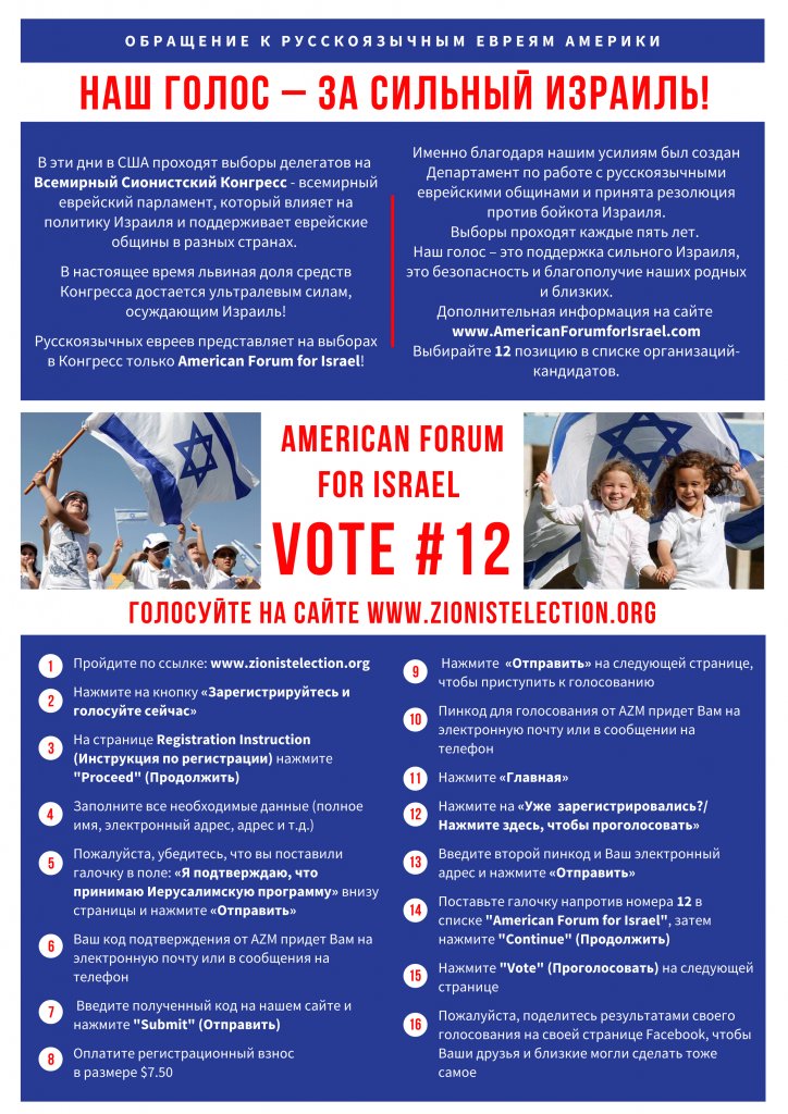 Проголосовать за American Forum for Israel – единственную баллотирующуюся в США организацию, все кандидаты от которой русскоязычные евреи-иммигранты, можно, нажав в списке организаций-кандидатов на №12 на сайте: www.americanforumforisrael.com (http://www.