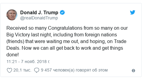 «От многих людей получил так много поздравлений с Большой Победой, одержанной прошлой ночью. Среди поздравивших были иностранные государства (друзья), которые за меня болели и надеялись заключить торговые сделки. Теперь мы все можем вернуться к работе и заниматься делами!», — написал Трамп утром в среду.
