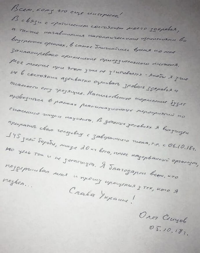 «В данных условиях я вынужден прекратить свою голодовку с завтрашнего числа, т.е. с 06.10.18 г», – идет речь также в письме.