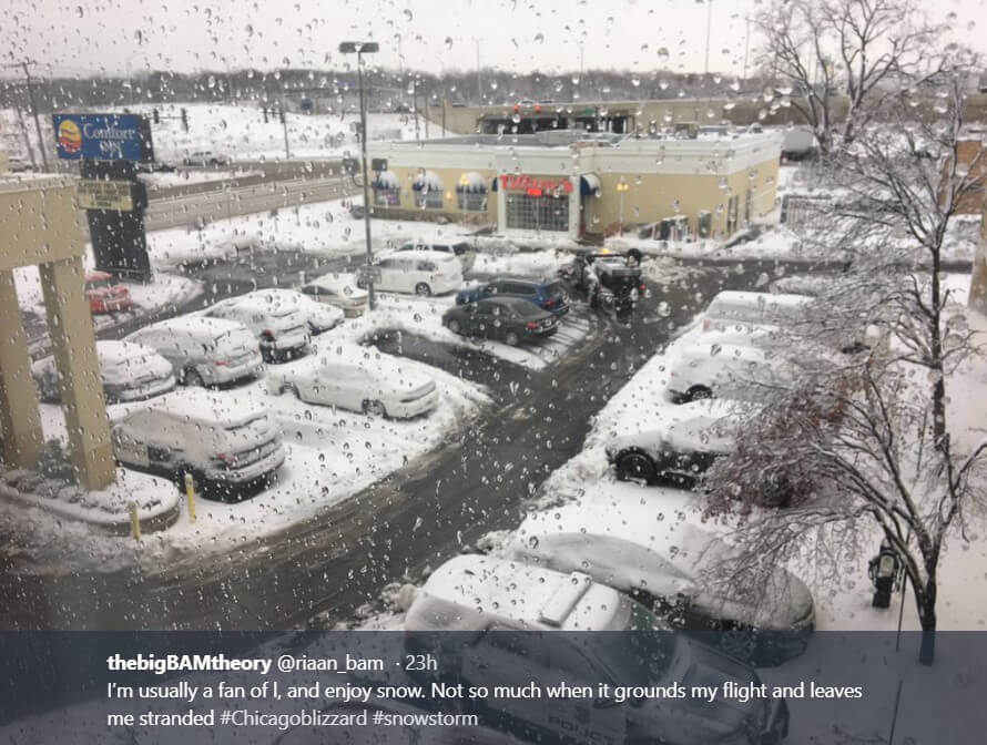 По данным FlightAware.com, более 1600 рейсов внутри страны, а также вылетающих из США и прилетающих в страну, были отменены в понедельник. Хуже всего пришлось международному аэропорту О’Хара в Чикаго — более 1300 отмененных рейсов и задержки в среднем на 40 минут из-за сильного снегопада.