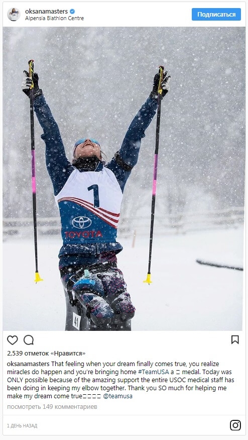 Мастерс, четырехкратная паралимпийcкая чемпионка, выиграла спринт по пересеченной местности в среду, 14 марта, в Пхёнчхане. В гонке на расстояние 1,1 километр она опередила немку Андреа Эксау более чем на две секунды, пишет USA Today.