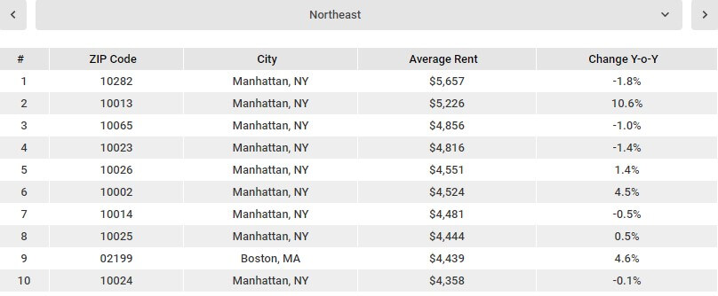 Первое и второе место по дороговизне заняли почтовые индексы из Манхэттена. 10282 и 10013 охватывают популярный район Нижнего Манхэттена, в том числе Рокфеллер-парк в Бэттери-Парк-сити, а также нижнюю часть Сохо, большую часть Трайбека и западные кварталы Чайнатауна. Фактически, 10282 сохранил свою лидирующую позицию, несмотря на то что средняя цена аренды снизилась до 5 657 долларов, что на 1,8% меньше, чем в июле 2017 года.