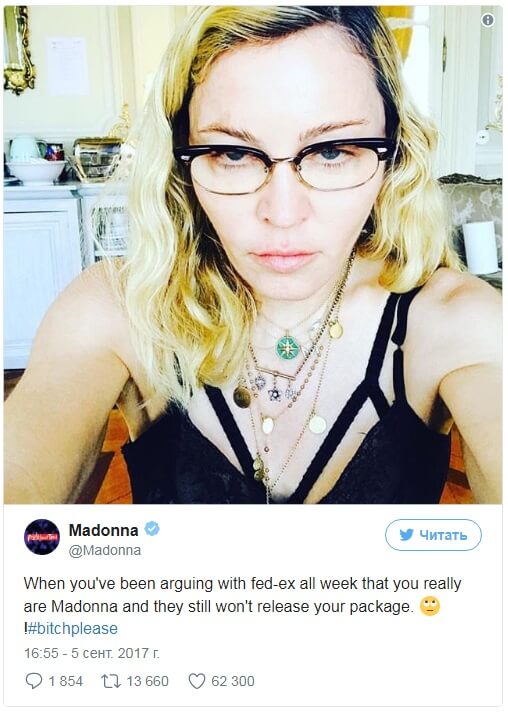5 сентября она написала, что служба доставки не отдает певице посылку. Мадонна написала, что уже неделю как не может доказать сотрудникам компании, что не самозванка.