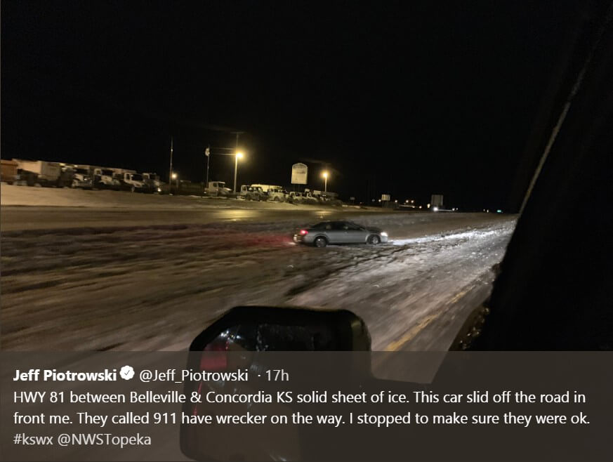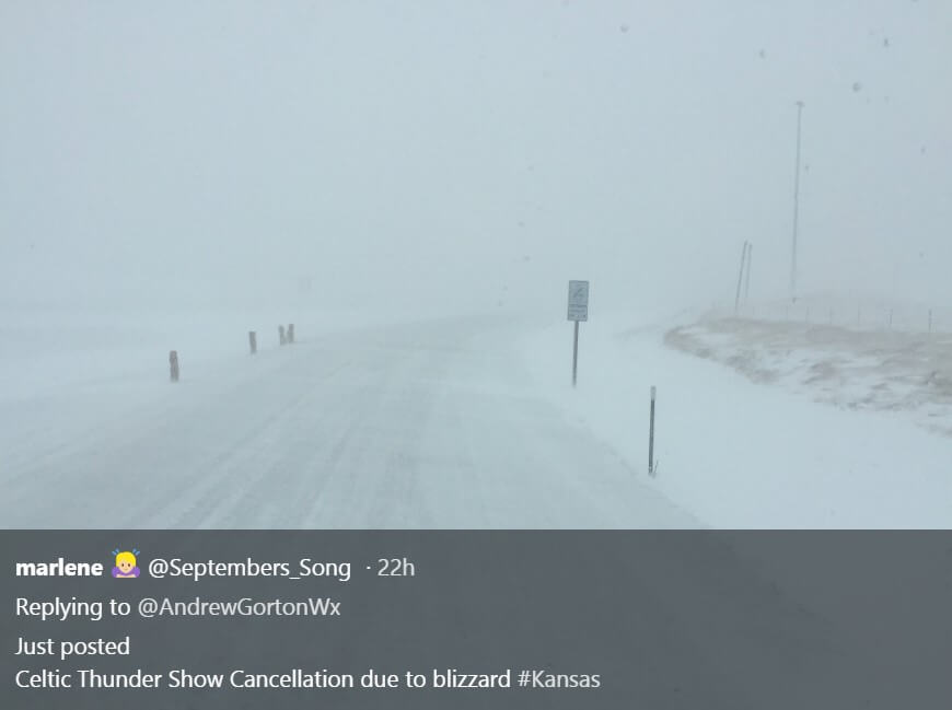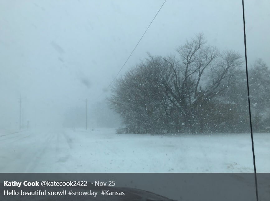 Согласно данным Национальной метеорологической службы, снежная буря в воскресенье привела к ухудшению погодных условий в Канзасе — были выпущены предупреждения о метели и снежных заносах по мере продвижения бури на север через Средний Запад в Новую Англию.