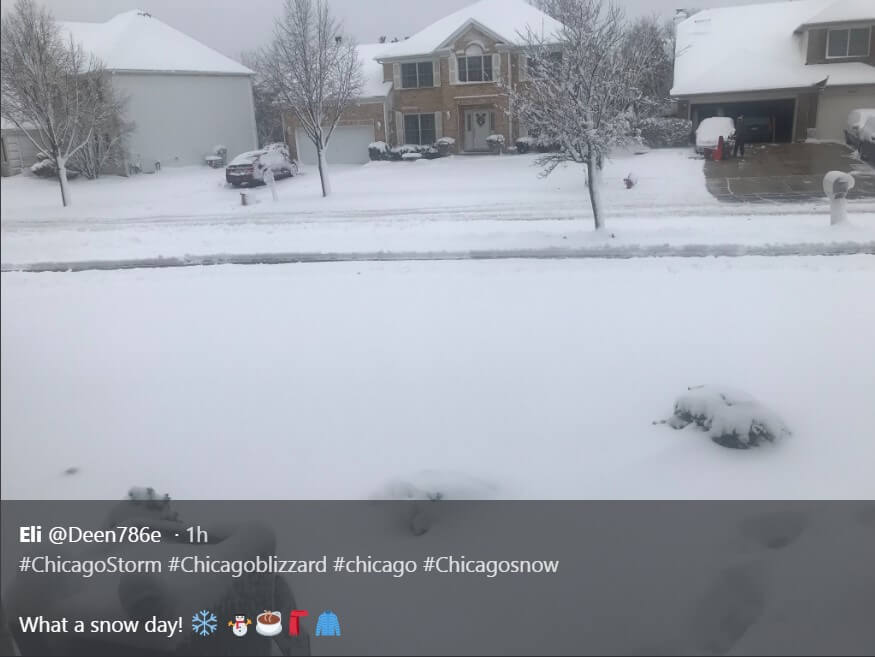 Сообщества Collaborative Rain, Snow и Hail Network в Чикаго за ночь зарегистрировали от 3 и 10 дюймов (7,5-25 см) снега. Веб-сайт утверждает, что Elk Grove Village, Roselle, St. Charles и Schaumburg получили 10 дюймов или более, в то время как Palatine — около 6 дюймов, а Gurnee и Mundelein — 8 дюймов или больше.