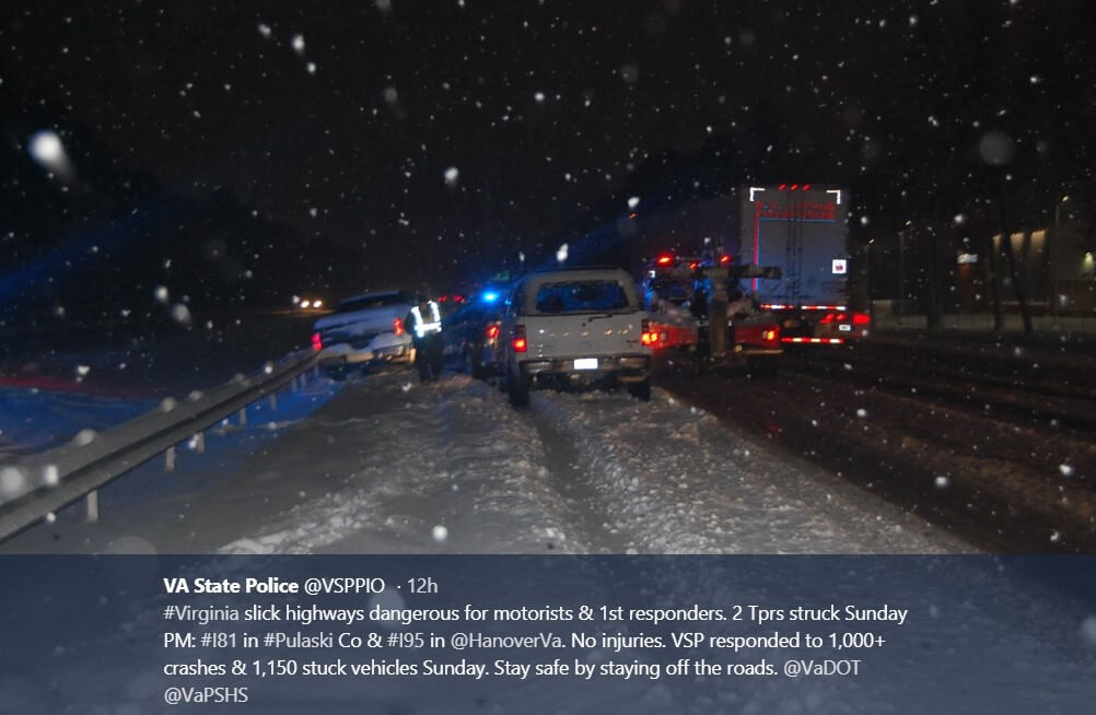 Полиция в Северной Каролине и Вирджинии заявила, что по состоянию на воскресенье службы отреагировали на сотни дорожно-транспортных происшествий, связанных со снегом, поскольку автомобили, грузовики и фуры с трудом справлялись со снегом и льдом.