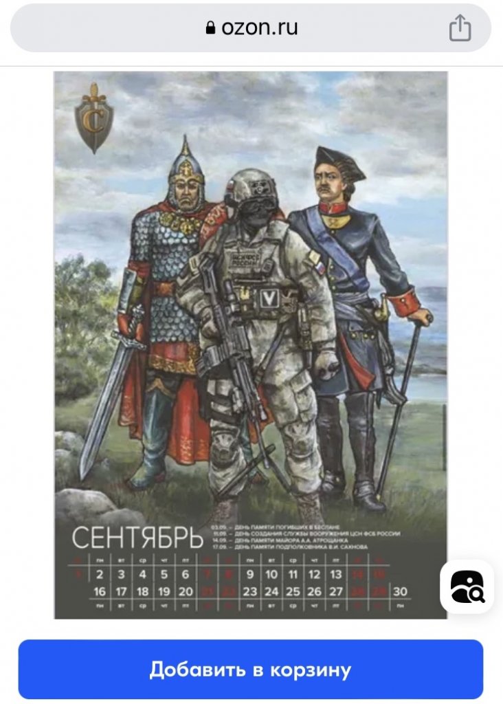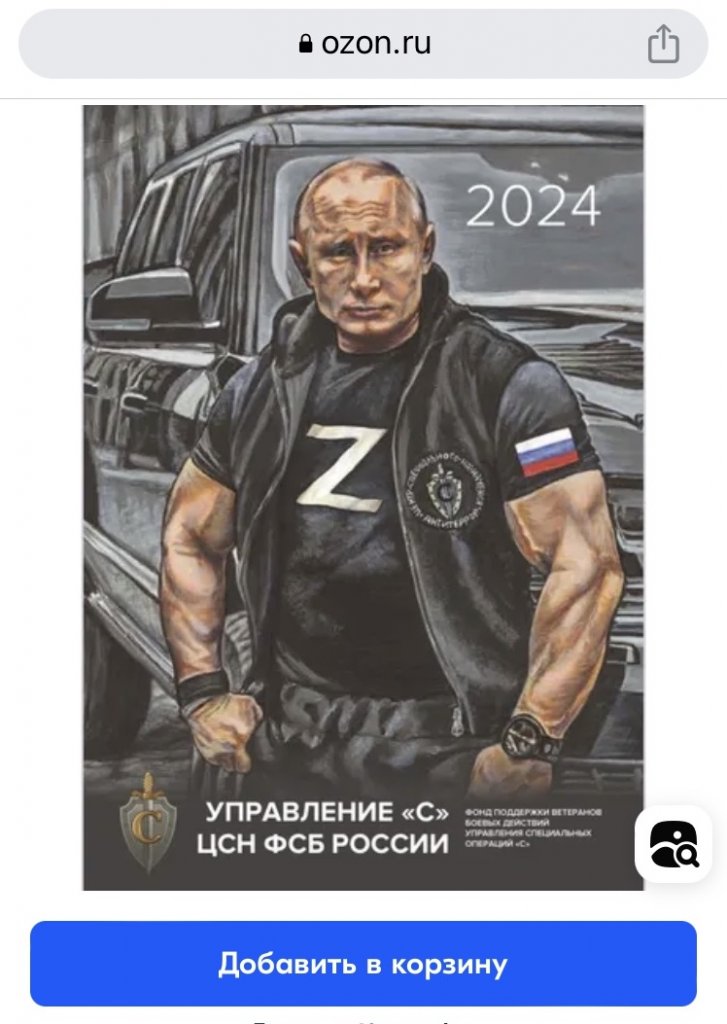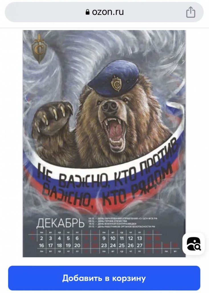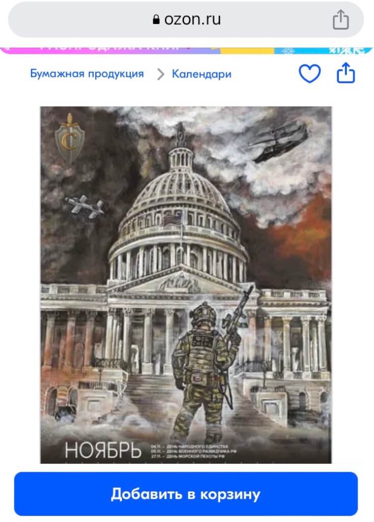 Календарь, продаваемый благотворительной организацией, поддерживающей ветеранов Федеральной службы безопасности (ФСБ) России, содержит поразительно пропагандистские изображения. Среди них, например, российский солдат, который готов к войне у Капитолия США в Вашингтоне (округ Колумбия). Об этом пишет Newsweek.