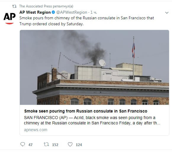 Немного спустя, из здания консульства Сан-Франциско начал идти черный дым. Пожарные, прибывшие на место, не смогли войти в здание. Их попросту не пустили в консульство, пишет ABC News.